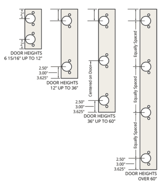 To determine how many hinges to purchase, refer to the doors on your order and this drawing. All doors will need a minimum of 2 hinges. Doors that are 36″ up to 60″, will need 3 hinges each and doors that are over 60″ will need 4 hinges each.